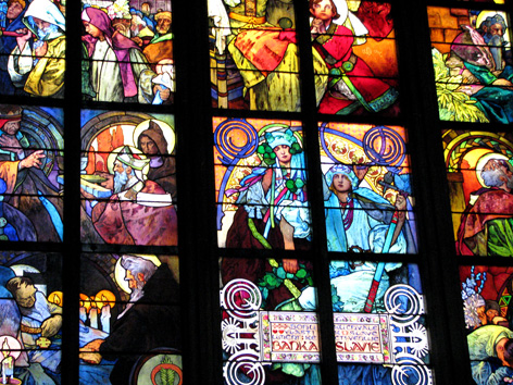 Внутри вот такие витражи